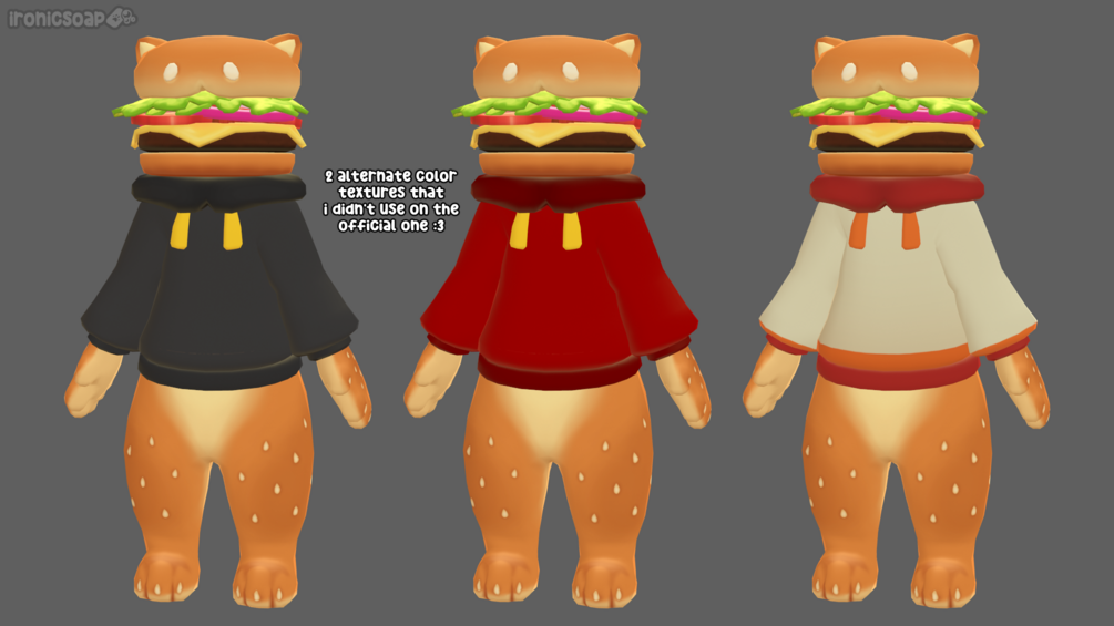 - If you want to have it as an occasional model you use on stream, that is fine! However I do not wish for "Burger Cat" the character to be linked to any specific entity besides me (ironicsoap) or VRChat.