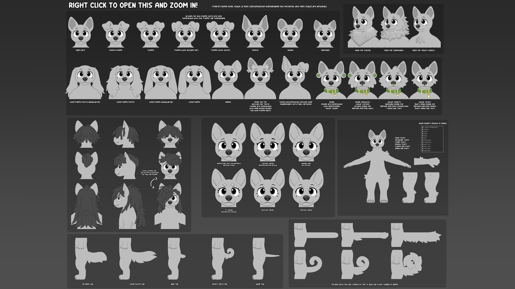 - Toggles: Collar, claws, tail curl (only for the big curl tail), tired / lazy eyes